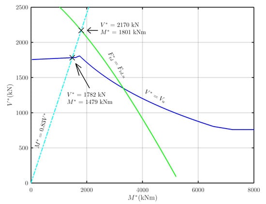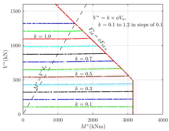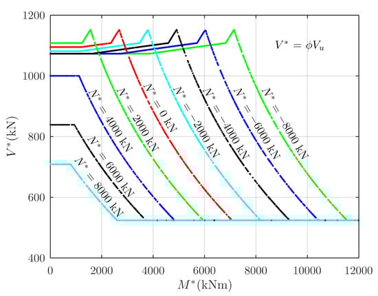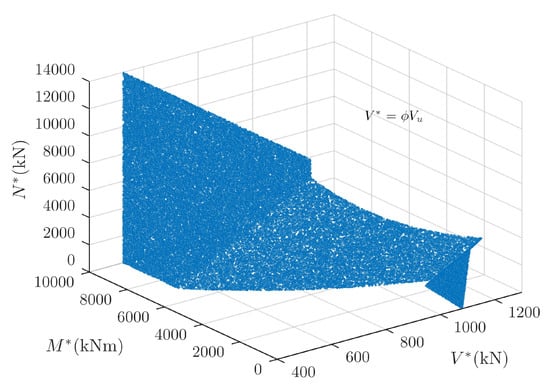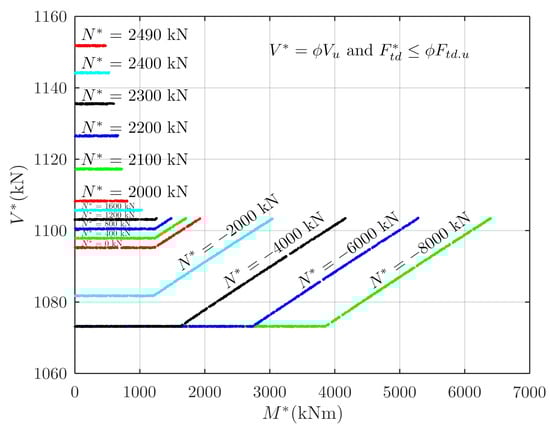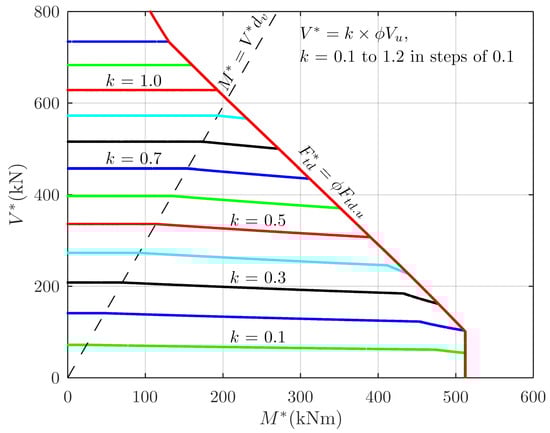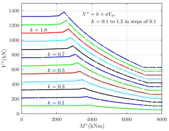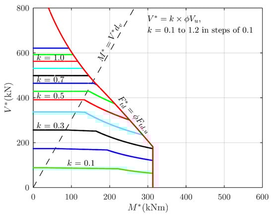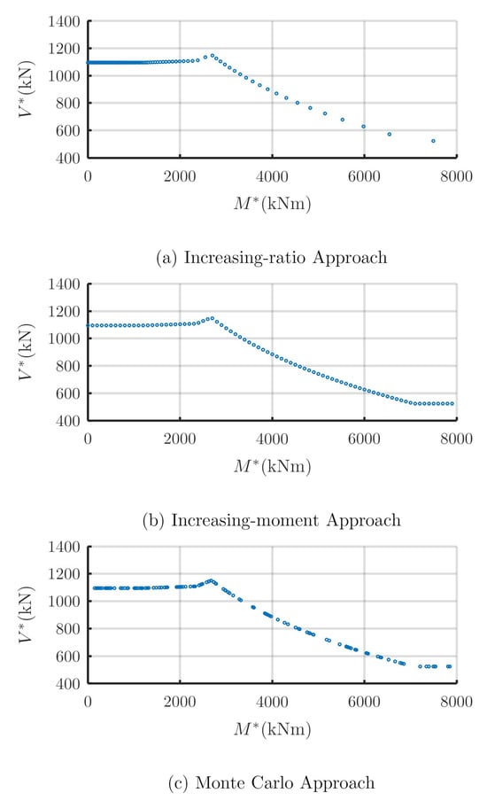 This paper presents three different approaches for generating points along the interaction diagram corresponding to design load effects—shear, bending moment, and axial force—to achieve optimal shear strength adequacy with the Australian bridge design standard AS 5100.5. The methodology targets the optimal shear condition by matching the design shear with the capacity , which represents achieving a load rating factor of unity within the specified tolerance limits. The first typical approach for generating points for two load effects is by increasing the moment–shear ratio in small increments from zero to a large value (theoretically infinity), and for each increment, to goal-seek the condition. The other approaches investigated are the use of increasing factored moment and the use of Monte Carlo simulation. A pretensioned bridge I-girder section reported in the literature was used in the study. The Monte Carlo simulation method was found to be the simplest to program. It allows an interaction surface for the influence of three load effects for optimal shear adequacy to be obtained with minimal program coding and outperforms the goal–seeking approaches for multi-variable interactions. It can create 2-D interaction lines for various levels of shear adequacy for the interaction of and , and 3-D interaction surfaces for , , and . The potential use of interaction diagrams was explored, and the advantages and limitations of using each method are presented. The interaction curves of two typical pretensioned concrete sections of a plank girder, one next to an end support and the other close to mid-span, were created to show the distinguishing features resulting from their reinforcement.