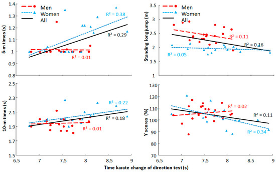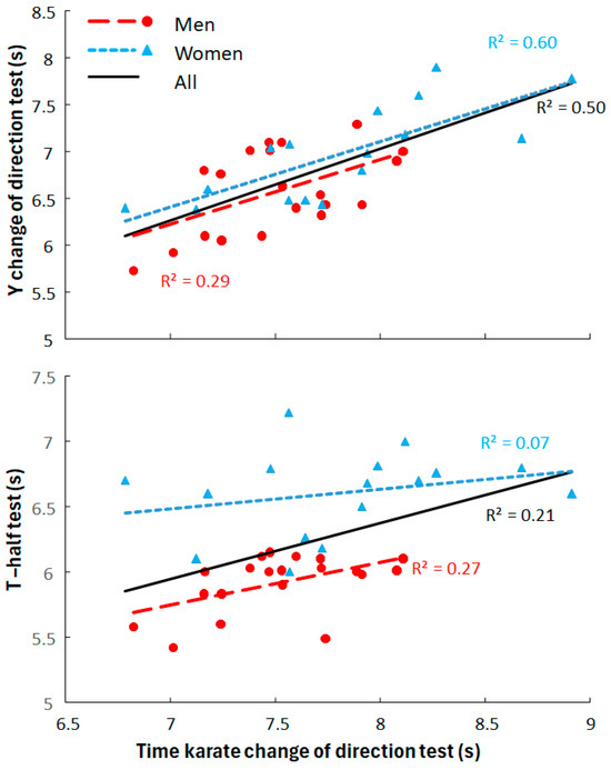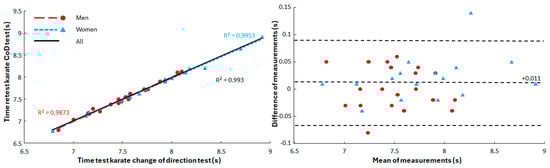 Background: Change-of-direction (CoD) ability is critical in karate, yet sport-specific assessment tools are limited. This study aimed to evaluate the reliability and validity of a newly developed karate-specific CoD test for male and female athletes and to examine its relationships with other motor performance measures. Methods: Thirty-six experienced karatekas (20 men: age 20.8 ± 1.8 years, height 1.79 ± 0.05 m, body mass 73.1 ± 10.6 kg; 16 women: age 21.2 ± 1.7 years, height 1.67 ± 0.04 m, body mass 63.5 ± 8.9 kg), all national squad members, participated. Athletes performed the karate CoD test twice to assess test–retest reliability, and completed additional CoD tests (Y CoD, T-half), linear sprint tests, standing long jump, and Y-balance tests to evaluate criterion validity and associations with other motor abilities. Results: The karate CoD test demonstrated excellent reliability (ICC = 0.996), with similar consistency in men and women. Criterion validity was supported by a meaningful correlation with the Y CoD test, but not with the T-half test. Associations with linear sprinting and lower-limb power (standing long jump) were weak or inconsistent, indicating that karate-specific CoD performance is distinct from general physical capacities. Conclusions: The karate CoD test shows good reliability and validity for assessing planned change-of-direction ability in elite karate athletes. Its use should be limited to pre-planned movements and complemented with other tests (e.g., reactive agility, sprinting, jumping, strength) for a fuller performance assessment.