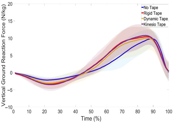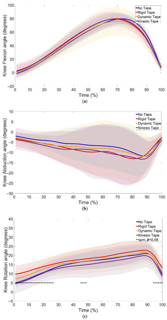 Background: The use of knee taping is widely used to enhance stability and landing performance. However, its impact on jumping performance, a key sports performance determinant, remains unknown. Objective: This study aimed to evaluate the effects of knee taping on continuous biomechanics during the countermovement jump (CMJ). Methods: Nineteen recreational female netball players (age 22 ± 2.69 years; height 167.76 ± 7.47 cm; mass 63.32 ± 10.57 kg) performed CMJs under four taping conditions—no tape (NT), rigid tape (RT), dynamic tape (DT), and kinesio tape (KT). All participants completed all four conditions. Continuous biomechanical data were analysed using one-dimensional statistical parametric mapping (SPM1d) with repeated measures ANOVA (p < 0.05). Results: KT significantly reduced time to take-off (from 2.01 ± 0.67 s with NT to 1.26 ± 0.61 s with KT, p < 0.001) and increased modified reactive strength index (from 0.12 ± 0.05 with NT to 0.21 ± 0.06 with KT, p < 0.001). RT increased braking phase velocity compared to NT (−1.53 ± 0.57 m/s vs. −1.69 ± 0.62 m/s, p = 0.01). SPM1d revealed significant kinematic changes across conditions, including reduced ankle flexion and hip flexion with KT, and increased knee rotation with RT and DT. Conclusions: Knee taping modified joint kinematics without enhancing maximal outputs such as power or jump height. KT improved reactive strength indices, suggesting potential benefits for rapid jump performance, while RT and DT mainly altered joint coordination.