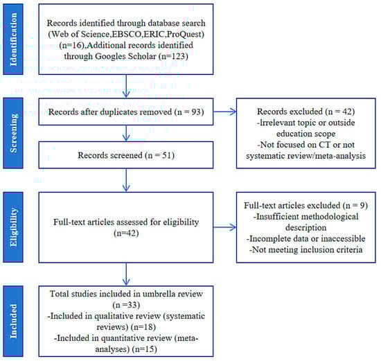 This study reviews 33 meta-analyses and systematic reviews on Computational Thinking (CT), focusing on research quality, intervention effectiveness, and content. Quality assessment of included studies was conducted using the AMSTAR 2 tool. The meta-analysis achieved an average score of 10.9 (a total of