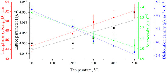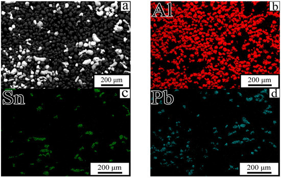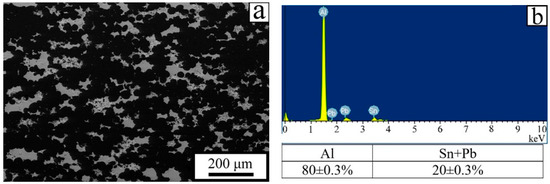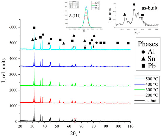 The work studied the effect of high-temperature annealing on the phase composition, microstructure, and mechanical properties of an AlSn10Pb10 vol.% alloy obtained by laser powder bed fusion (LPBF). For this purpose, a series of anneals was carried out in the temperature range of 200–500 °C with a duration of 30 min. Using X-ray diffraction, it was determined that the annealed samples had a three-phase structure consisting of Al, β-Sn, and α-Pb phases, with a gradual decrease in their lattice elastic strain and dislocation density as the heating temperature increased. Analysis of the obtained SEM images revealed that these changes were accompanied by the coarsening of Sn and Pb inclusions and growth of the pure aluminum areas. As a result of the described structural changes with increasing annealing temperature, the ultimate compressive strength of the alloy monotonically decreased from 108 MPa (in the as-built state) to 75 MPa after annealing at 500 °C. The alloy’s ductility (strain at peak stress) also improved and reached a maximum of 26% after annealing at 400 °C. Compression test results showed that the optimal combination of ductility and strength of the LPBF-processed AlSn10Pb10 alloy was observed after annealing at 400 °C.
