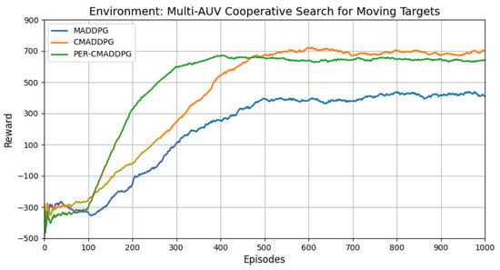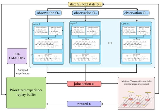 This paper proposes a convolutional multi-agent deep deterministic policy gradient method with prioritized experience replay (PER-CMADDPG) for the problem of multi-AUV cooperative search for moving targets. A comprehensive mathematical model of the multi-AUV cooperative search for moving targets is first established, which includes the environment model, the AUV model, and the information update and fusion model. Building upon the MADDPG framework, the proposed PER-CMADDPG method introduces two major enhancements. Convolutional neural networks (CNNs) are integrated into both the actor and critic networks to extract spatial features from local observation maps and global states, enabling agents to better perceive the spatial structure of the environment. In addition, a prioritized experience replay (PER) mechanism is incorporated to improve learning efficiency by emphasizing informative experiences during training, thereby accelerating policy convergence. Simulation experiments demonstrate that the proposed method achieves faster convergence and higher rewards compared with MADDPG. Furthermore, the influences of the multi-AUV cluster system’s scale, AUV speed, and sonar detection radius on performance are analyzed. The results verify the effectiveness of the proposed PER-CMADDPG method for the multi-AUV cooperative search for moving targets.