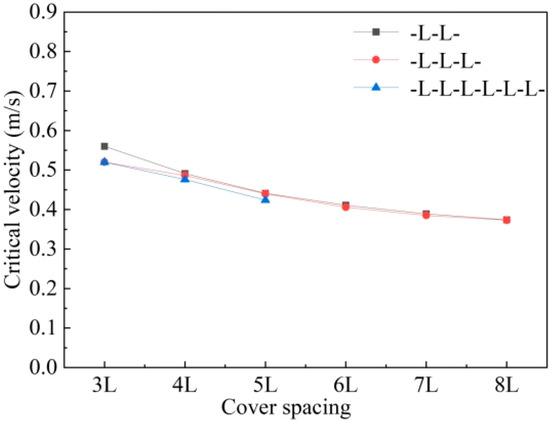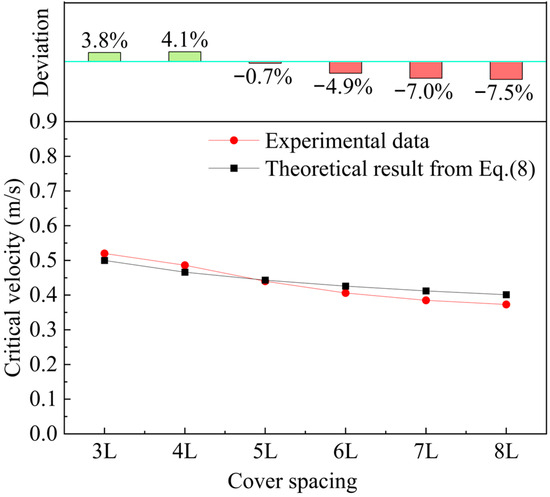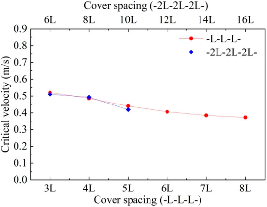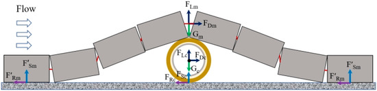 The safe and stable operation of submarine cables is a critical issue in offshore wind power engineering. This study presents an experimental and theoretical study on the stability of submarine cable protected by a sleeve (SCPS) with Articulated Concrete Mattresses (ACMs) protection on a flat hard seabed under current conditions. The instability modes of the SCPS–ACMs were identified, and the effects of the number of spans, cover spacing, and ACMs length on the critical instability velocity were investigated. The experimental results indicate that the primary instability mode of the SCPS–ACMs is the overall slip mode. An increase in cover spacing enlarges the exposure scale of the SCPS in the flow environment, thereby reducing the critical velocity. Employing at least two spans effectively mitigates the boundary effect induced by the flow past the SCPS at its ends, thus ensuring the reliability of the experimental model. The critical velocity is fundamentally determined by the dimensionless parameter—the ACMs coverage ratio (incorporating both the ACMs length and cover spacing). Based on the experimental results and force analysis, a theoretical equation reflecting the intrinsic relationship between the ACMs’ cover spacing and critical velocity was established. Key parameters in the equation, such as the friction coefficient, hydrodynamic coefficients (including the lift coefficient and drag coefficient), and weight distribution coefficients, were determined. Finally, the theoretical results were validated against the experimental data, showing a good agreement and verifying the reliability of the theoretical formula. The findings of this research can provide crucial support for the optimal design of ACMs protection schemes for submarine cables on the hard seabed.