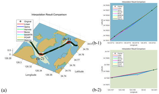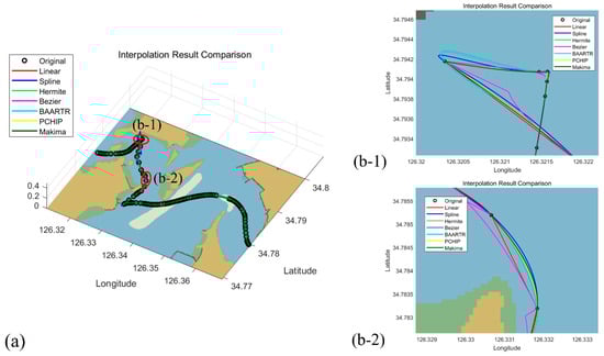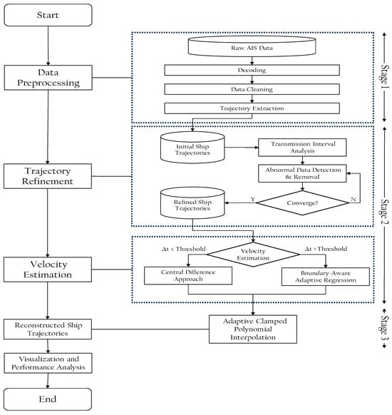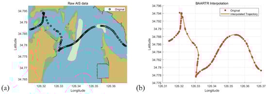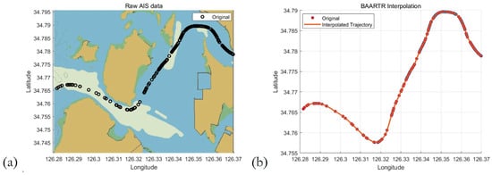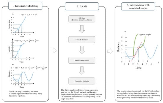 The Automatic Identification System (AIS) frequently suffers from data loss and irregular report intervals in real maritime environments, compromising the reliability of downstream navigation, monitoring, and trajectory reconstruction tasks. To address these challenges, we propose BAARTR (Boundary-Aware Adaptive Regression for Kinematically Consistent Vessel Trajectory Reconstruction), a novel kinematically consistent interpolation framework. Operating solely on time, latitude, and longitude inputs, BAARTR explicitly enforces boundary velocities derived from raw AIS data. The framework adaptively selects a velocity-estimation strategy based on the AIS reporting gap: central differencing is applied for short intervals, while a hierarchical cubic velocity regression with a quadratic acceleration constraint is employed for long or irregular gaps to iteratively refine endpoint slopes. These boundary slopes are subsequently incorporated into a clamped quartic interpolation at a 1 s resolution, effectively suppressing overshoots and ensuring velocity continuity across segments. We evaluated BAARTR against Linear, Spline, Hermite, Bezier, Piecewise cubic hermite interpolating polynomial (PCHIP) and Modified akima (Makima) methods using real-world AIS data collected from the Mokpo Port channel, Republic of Korea (2023–2024), across three representative vessels. The experimental results demonstrate that BAARTR achieves superior reconstruction accuracy while maintaining strictly linear time complexity ( ). BAARTR consistently achieved the lowest median Root Mean Square Error (RMSE) and the narrowest Interquartile Ranges (IQR), producing visibly smoother and more kinematically plausible paths-especially in high-curvature turns where standard geometric interpolations tend to oscillate. Furthermore, sensitivity analysis shows stable performance with a modest training window (n ≈ 16) and minimal regression iterations (m = 2–3). By reducing reliance on large training datasets, BAARTR offers a lightweight, extensible foundation for post-processing in Maritime Autonomous Surface Ship (MASS) and Vessel Traffic Service (VTS), as well as for accident reconstruction and multi-sensor fusion.