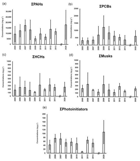 The occurrence and spatial distribution of polycyclic aromatic hydrocarbons (PAHs), polychlorinated biphenyls (PCBs), organochlorine pesticides (OCPs), fragrances, UV filters and photoinitiators were investigated in surface sediments of Nerbioi-Ibaizabal estuary between 2005 and 2013, in 2020. Samples were extracted by focused ultrasound solid–liquid extraction technique and analyzed by gas chromatography coupled with mass spectrometry. Total PAHs, PCBs, OCPs, musks, UV filters and photoinitiators concentrations ranged between not detected (n.d.) and 43000 ng g−1, n.d. and 2500 ng g−1, n.d. and 820 ng g−1, n.d. and 880 ng g−1, n.d. and 91 ng g−1 and from nd to 120 ng g−1, respectively. Hexachlorocyclohexanes (HCHs) were ubiquitous in the estuary, suggesting that these compounds, although banned, leach from landfills. The PCB concentrations showed a decreasing trend. Ecological risk assessments based on sediment quality guidelines (SQGs) and risk quotient (RQ) suggested semi-volatile organic compounds could represent a potential ecological risk in the Nerbioi-Ibaizabal estuary.