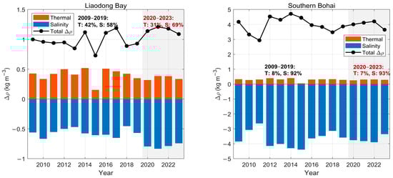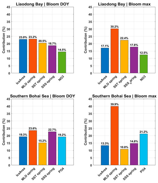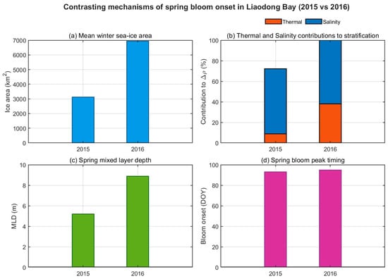 Spring phytoplankton bloom mechanisms in the Bohai Sea show clear spatial differences, but the physical–biological coupling in the ice-covered Liaodong Bay (LDB) remains poorly understood. Utilizing satellite observations and high-resolution reanalysis data from 2009 to 2023, this study explores the drivers of spring blooms through generalized additive models (GAMs) and the Equation of State of Seawater (EOS). The results reveal pronounced regional heterogeneity. In the southern Bohai Sea, bloom dynamics are co-regulated by a complex combination of nutrient availability and localized physical mixing. In contrast, blooms in LDB are predominantly driven by the shoaling of the mixed layer depth (MLD), a physical state intrinsically linked to winter sea-ice melt. Linear decomposition of water density via EOS quantitatively demonstrates that spring stratification in LDB is salinity-dominated (contributing ~60.7%), rather than thermally driven. The rapid influx of low-salinity meltwater forms a strong halocline that suppresses vertical mixing and physically compresses the MLD into the euphotic zone. Consistent with Sverdrup’s Critical Depth Theory, this inferred physical pathway effectively alleviates light limitation and acts as the primary trigger for the early bloom peak timing. This complete melting–freshening–stratification–light coupling chain provides a novel physical perspective on how mid-latitude marginal sea ecosystems respond to climate change, distinct from canonical polar light-limitation models.