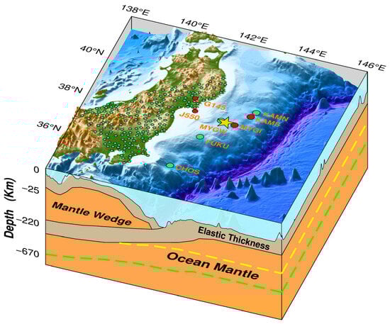 Postseismic deformation observed by terrestrial Global Navigation Satellite System (GNSS) and seafloor GNSS-Acoustic techniques (GNSS-A) provides essential constraints on the depth-dependent viscoelastic structure of subduction zones. In this study, we collect and process decadal postseismic observations following the 2011 Tohoku-oki Mw9.0 earthquake, including 232 onshore GNSS stations and six offshore GNSS-A sites. After removing the interseismic velocity terms, we extract the postseismic deformation signals mainly driven by viscoelastic relaxation during the period from 3 to 9 years after the earthquake. The inversion is primarily constrained by horizontal displacements, which have higher accuracy than vertical observations. We adopt a radially layered viscoelastic Earth model with lateral heterogeneity between continental and oceanic domains based on the Burgers rheology and half-space dislocation theory. Using the least-squares principle, we invert for the optimal viscoelastic structure under the strong constraint of fixed mantle viscosity. The optimal continental and oceanic crustal elastic thicknesses are 24.4 km and 37 km, with minimum horizontal Root-Mean-Square errors (RMS) of 5.68 cm and 6.81 cm, respectively. The mantle viscosity shows significant depth-dependence and obvious land–ocean differences. These results verify the critical role of joint land and seafloor geodetic constraints and provide a refined viscoelastic structure model for subduction zones.