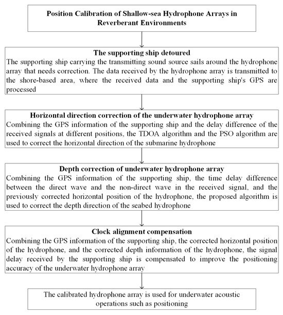 To address the problem of shallow-sea hydrophone calibration, this paper proposes a shallow-sea hydrophone calibration algorithm for the horizontal and depth directions, respectively. In the horizontal direction, a calibration method combining an improved Particle Swarm Optimization (PSO) algorithm and the Time Difference Of