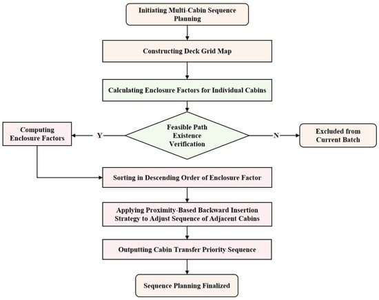 In the construction of large cruise ships, the restricted deck space and dense obstacles create a strongly coupled problem between path planning and sequence optimization during prefabricated cabin boarding operations, significantly impairing overall installation efficiency. To coordinately optimize the boarding sequence of multiple cabins and minimize operational conflicts, this study proposes a dual-layer coordinated planning methodology. The lower layer generates feasible paths satisfying kinematic and contour-based obstacle avoidance constraints through optimal control theory, while the upper layer introduces a dynamic priority evaluation mechanism based on grid mapping and an “enclosure factor”, combined with a reverse planning strategy to dynamically adjust the cabin boarding sequence. Through iterative feedback between path feasibility and sequence efficiency, the proposed method effectively resolves the strong coupling between sequencing and path planning. Case validation demonstrates that the proposed approach significantly reduces total installation time compared to conventional sequence planning methods, proving its effectiveness and practical value in enhancing the efficiency of coordinated multi-cabin installation.