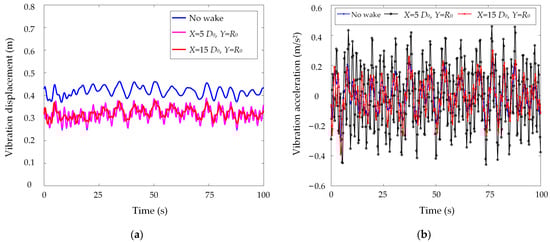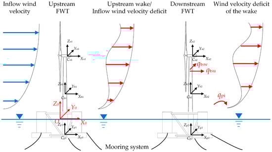 Floating offshore wind turbines (FOWTs) are crucial for harnessing deep-sea wind energy resources. However, existing studies on FOWTs have predominantly focused on standalone wind turbines, neglecting the wake effects from upstream turbines within the offshore wind farms, thereby leading to inaccurate analyses. This study developed a coupled dynamic analysis method integrating aerodynamics, hydrodynamics, and mooring dynamics, incorporating the upstream wake effects through a three-dimensional (3D) Gaussian wake model and a nonlinear lift line free vortex wake (LLFVW) model. The proposed method was validated through comparisons with experiments in the wave tank and on the equivalent mechanism by the scaled-down models. Dynamic responses in four upstream wake conditions, i.e., no-wake, central wake, lateral offset wake, and multi-wake conditions, were simulated. The results indicated that upstream wake effects exert a significant influence on the dynamic responses of the FOWTs. All the three wake conditions markedly reduced the vibration displacement, fore–aft and side-to-side moments due to velocity deficits. Compared to the central wake, the lateral offset wake exerted a more pronounced effect on the fluctuations in tower-top vibration acceleration, the variations in tower-base moment, and the fluctuations in platform pitch acceleration, thereby posing critical fatigue risks. In contrast, multi-wake effects are less pronounced under the studied configuration. These findings emphasize the necessity of avoiding lateral offset exposures in wind farm layout planning. The proposed framework offers a practical tool for wake-aware design and optimization of FOWTs arrays.