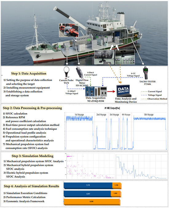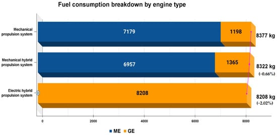 To achieve carbon neutrality in shipping and comply with the IMO’s increasingly stringent environmental regulations, the transition of small and medium-sized workboats to eco-friendly alternatives is an urgent issue. This study quantitatively compares the fuel efficiency and operational fuel cost savings of hybrid propulsion systems based on actual operational data from a buoy maintenance vessel. The methodology comprised four stages: First, measurement equipment was installed on the vessel to collect real-sea data. Second, the collected data were processed to derive specific fuel oil consumption curves and load profiles. Third, fuel consumption models for mechanical and hybrid propulsion systems were developed. The battery capacity of the hybrid models was selected based on actual operational requirements. Performance indicators and economic analyses were conducted for a comparative evaluation. Fourth, simulation results indicated that the hybrid electric system achieves 2.02% fuel savings, translating to annual fuel savings of USD 1053.24 and a corresponding 2.02% CO2 reduction. The hybrid mechanical system yielded 0.66% savings. These improvements are attributed to a rule-based energy management strategy of operating generators at their optimal efficiency points and shutting down main engines during low-load periods. This study provides empirical evidence supporting Korea’s 2030 eco-friendly public vessel transition plan.