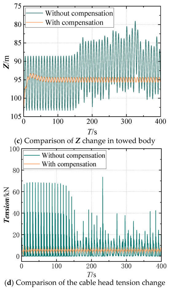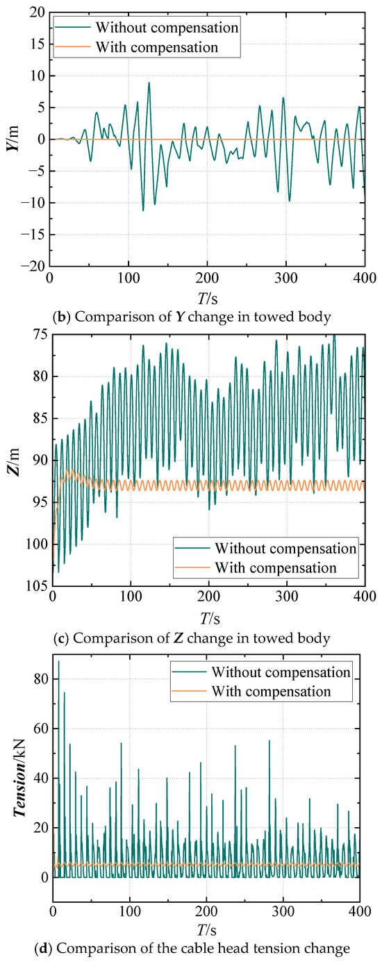 In harsh marine environments, during the operation of the Ship–Cable–Body coupled system, the towed cable may become slack or taut, and tension oscillations may occur, leading to cable breakage or launch and recovery system (LARS) damage, underscoring the need for effective compensation control.