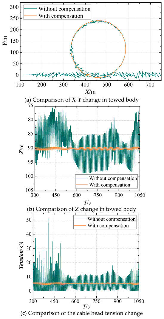In harsh marine environments, during the operation of the Ship–Cable–Body coupled system, the towed cable may become slack or taut, and tension oscillations may occur, leading to cable breakage or launch and recovery system (LARS) damage, underscoring the need for effective compensation control. Traditional offline and static simulation methods fail to capture the system’s dynamics, leading to inaccurate validation of control strategies. To address this, we propose a real-time dynamic modeling framework using the OrcFxAPI, enabling millisecond-level bidirectional interaction between the towed body’s motion and LARS commands. By integrating a Python 3.10-based PID controller with OrcFxAPI, the framework achieves real-time active heave compensation (AHC) in deep-sea towing, dynamically adjusting cable length and payout speed based on feedback to suppress vibrations. Unlike prior studies focused on launch and recovery, this work systematically evaluates AHC performance during typical operations (hovering, linear and turning motion), and compares system responses with and without compensation. Results show the AHC framework significantly improves towed body stability, reduces tension fluctuations, and keeps tension within safe working limits (SWLs), while identifying critical cable payout speed thresholds for practical operation. The approach validates the use of OrcFxAPI for high-fidelity real-time coupling analysis and provides a reliable tool for optimizing control and design of deep-sea towing systems.