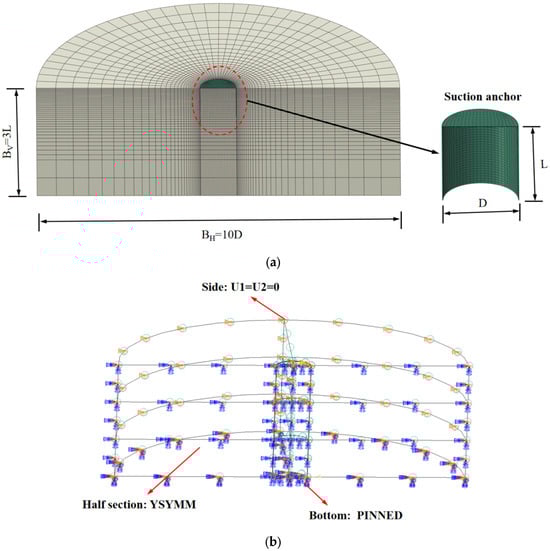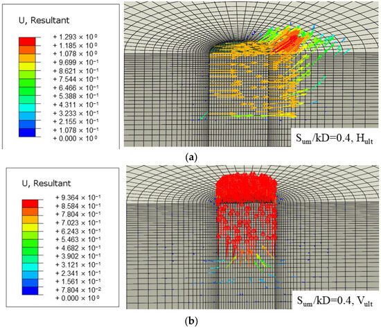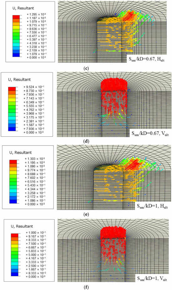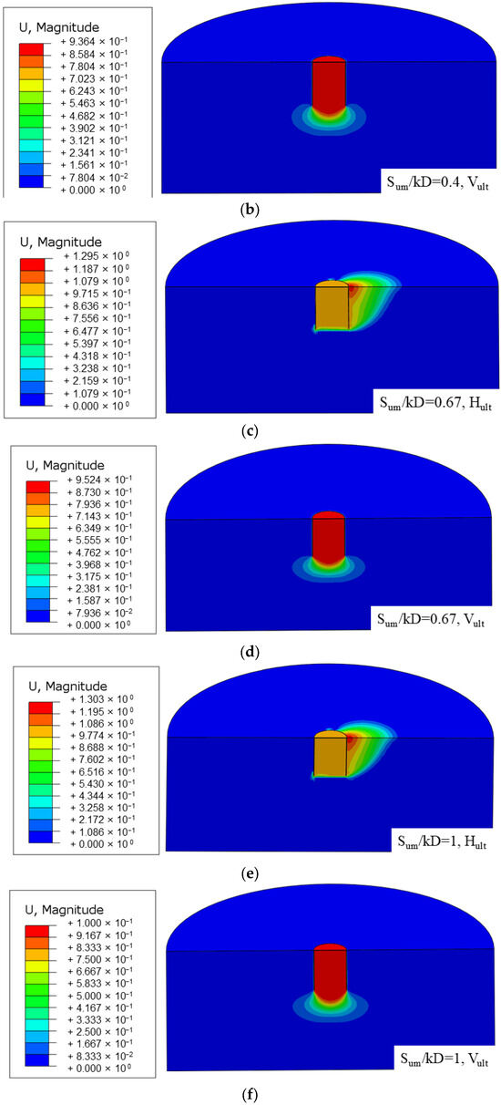 Suction anchors are widely used in marine engineering because of their easy installation, cost-effectiveness, and excellent load-bearing capacity. However, existing research on their bearing capacity has primarily focused on homogeneous soils, which fails to adequately reflect the actual bearing capacity of layered seabed soils. Therefore, this study conducted a series of numerical simulations to investigate the pullout bearing capacity of suction anchors subjected to inclined loads in upper-stiff–lower-soft layered clay. By considering the clay strength (Sum/kD) and soil layer thickness ratio (Th/L, Tc/L), this study systematically explores the influence of the optimal centerline loading depth (Zcl,opt), uniaxial ultimate bearing capacity (Hult and Vult), and the VH failure envelope of suction anchors. The results indicate that the layer thickness ratio Th/L of lightly overconsolidated clay (LOC) is the key factor influencing the Zcl,opt and ultimate bearing capacity Hult and Vult. An increase in Th/L significantly enhances the pullout resistance of suction anchors, which primarily results from the combined enhancement effect of lateral friction resistance and end resistance at the anchor–soil interface. The layered clay has a distinct influence on the horizontal and vertical bearing capacities of suction anchors. Based on the results of parameter analysis, a conservative analytical expression for the lower bound of the VH failure envelope curve is further proposed. The research conclusions provide a theoretical basis and engineering practice guidance for the optimized design and safety assessment of suction anchors in layered soil.