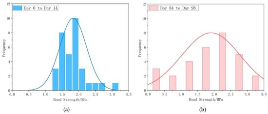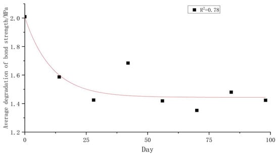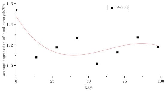 The strengthening performance of carbon-fiber-reinforced polymer (CFRP) in concrete structures primarily depends on the CFRP–concrete interfacial bond behavior. For CFRP-strengthened circular reinforced concrete (RC) pipe piles in marine environments, the interfacial bond behavior is susceptible to hygrothermal conditions. In this study, cylindrical concrete specimens were designed and subjected to pull-off tests to evaluate the CFRP–concrete interfacial performance under simulated marine environmental attacks (3 days in a 50 °C salt spray followed by 4 days of seawater immersion). The deterioration mechanism and failure modes of the CFRP–concrete bond behavior in such environments were analyzed, and relationship equations describing the interfacial bond degradation were proposed and validated. Test results indicated that the CFRP–concrete bond strength at circular interfaces is approximately 21% lower than that at planar interfaces. Under hygrothermal marine conditions, the average CFRP–concrete bond strength remained relatively stable in the early stages due to the competing effects of epoxy plasticization and post-curing, while variability increased significantly in later stages. For test specimens in Group A without concrete surface grinding before CFRP wrapping, an initial bond strength of 1.5 MPa was exhibited, while, for test specimens in Group B, with surface grinding, the initial bond strength started at 2.0 MPa. Both groups experienced a significant CFRP–concrete bond strength reduction of 0.4 MPa after the first wet–dry cycle, with the subsequent average strength stabilizing near initial values. Notably, Group B achieved a peak strength of 3.88 MPa at 84 days, attributed to surface grinding, which enhanced bond strength by 33% and delayed bond failure. The overall stable average strength resulted from averaging high-strength and degraded points. A bond degradation model based on averaged strength reduction was proposed: demonstrating a strength loss of 27%–36% after 98 days of accelerated marine environmental exposure. The proposed equations describing the interfacial bond degradation on a circular concrete surface predict well the flexural capacity of CFRP-wrapped RC beams under similar environmental conditions, where the calculated flexural capacity is 0.8 times the experimental value, confirming the model’s conservative and safe design applicability.