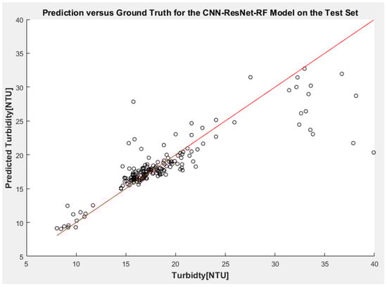 Addressing the limitations of traditional acoustic turbidity inversion models in complex marine environments—specifically their reliance on empirical parameters and lack of vertical resolution—this study presents a novel CNN-ResNet-RF hybrid model based on the simultaneous ADCP and turbidity observations in the Chengshantou sea area. Unlike conventional approaches, the proposed framework integrates deep spatio-temporal features automatically extracted by a ResNet-enhanced CNN, utilizing a Random Forest (RF) regressor for final prediction, thereby avoiding the limitations of artificial feature engineering. To ensure rigorous evaluation and mitigate stochastic bias, the model was validated using a 5-fold cross-validation strategy with dynamic Z-score normalization. Experimental results demonstrate that the proposed model significantly outperforms benchmark methods (CNN, RF, and CNN-RF), achieving an average R2 of 0.782, an MAE of 4.454, and a MAPE of 15.42% on the test sets. This study confirms that the hybrid framework successfully combines the feature extraction power of deep learning with the robustness of ensemble learning, providing a robust and high-precision tool for the vertical structural analysis of ocean turbidity.