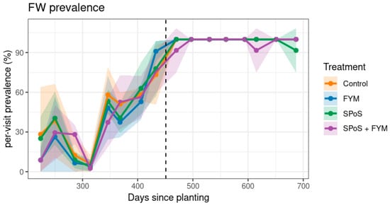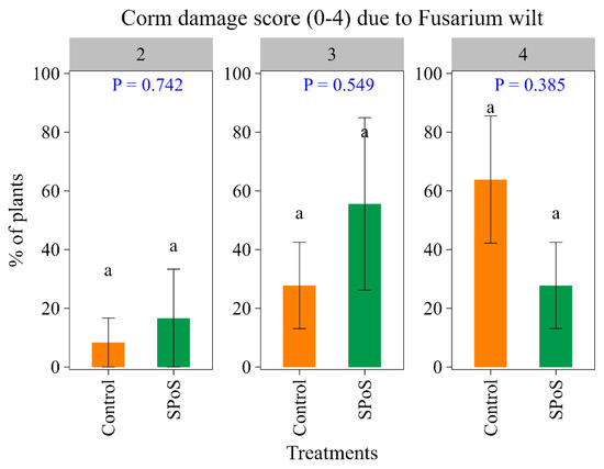 Fusarium oxysporum f. sp. cubense (Foc), the causal agent of Fusarium wilt of banana, can persist in the soil for extended periods as chlamydospores or endophytes in weeds, complicating control measures. No single control strategy is effective. Biological agents present an increasingly important control option. This study explored the potential of the spent P. ostreatus substrates (SPoS) to suppress Foc R1 in a field with high Foc inoculum, following laboratory and greenhouse studies that highlighted the potential of P. ostreatus as a biocontrol agent against Foc. A susceptible cultivar ‘Sukali Ndizi’ and a resistant cultivar ‘Mpologoma’ were used for the study. SPoS was compared with farmyard manure (FYM), a combination of SPoS with FYM and a control without treatment. A one-time application of the treatments at planting did not consistently and significantly (p > 0.05) reduce the prevalence and severity of leaf symptoms, pseudostem splitting and corm damage in the mother and ratoon plants of the susceptible cultivar. No symptoms occurred in ‘Mpologoma’. SPoS applications at planting and after every two months over an 8-month period did not significantly reduce leaf symptoms and corm damage in ‘Sukali Ndizi’, while it increased pseudostem splitting. The marginal and irregular reductions in FW could be due to an observed high weevil damage in SPoS treatments and other confounding factors such as weather, SPoS quality, and pathogen load in the field. Further research on weevil–SPoS interactions, use of P. ostreatus mycelium-rich substrate, and other confounding factors is crucial for fine tuning P. ostreatus use.