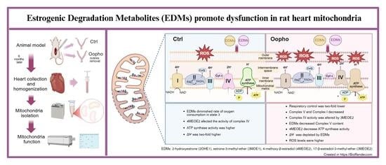 Mitochondria play crucial roles in various cellular functions, including ATP production, apoptosis, and calcium homeostasis. Signaling pathways and hormones such as estrogens regulate the mitochondrial network through genetic, epigenetic, and metabolic processes. Estrogens increase the efficiency of mitochondrial oxidative phosphorylation by preventing uncoupling. Upon reaching menopause, when estrogen levels decrease, impaired mitochondrial function (uncoupled oxidative phosphorylation, lower ATP yields) is observed. Like all hormones in the body, estrogens undergo metabolic processing, resulting in estrogenic degradation metabolites (EDMs). These metabolites can form adducts with genomic and mitochondrial DNA and are of particular interest due to their potential role as carcinogens. Given that estradiol influences mitochondrial function, it is possible that EDMs may have an impact on heart mitochondria. To investigate this, we used isolated heart mitochondria from control and oophorectomized (mimicking menopausal stage) female Wistar rats of the same age. We found that mitochondria exposed to EDMs exhibited reduced coupling of oxidative phosphorylation and diminished ATP production, while increasing reactive oxygen species generation. Furthermore, these effects were significantly stronger in mitochondria from oophorectomized rats than in mitochondria from control (intact) rats. In addition, mitochondrial oxidative phosphorylation complex activities were differentially affected: complex I and ATPase activities decreased, while complex IV remained unaffected. We propose that exposure to EDMs promotes mitochondrial dysfunction in rats and that these effects are exacerbated by oophorectomy, a procedure commonly used to model the effects of menopause in women.