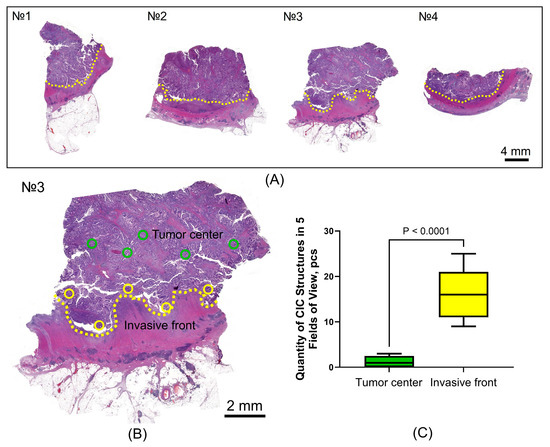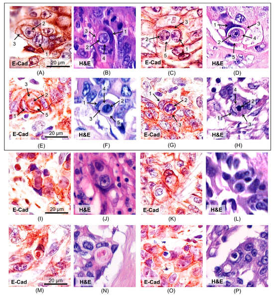 Background: Cell-in-cell (CIC) structure is a histological picture of a whole cell inside another cell. Homotypic CIC structures formed by cancer cells are consistently demonstrated to be a factor of poor prognosis and resistance to chemo- and immunotherapy in colorectal cancer (CRC). However, the absence of a standardized counting method limits the use of this factor in the applied research. Objective: To propose an adapted method for quantifying CIC structures in CRC surgical specimens and to evaluate their correlation with established adverse prognostic factors. Methods: A total of 250 histological slides of surgical specimens from 58 patients with pT1-pT4 colorectal adenocarcinoma were studied. Identification of tumor cells and visualization of CIC structures were performed by immunohistochemistry (CK20). Quantitative assessment was performed on digital scans of H&E stained slides. Quantitative assessment was performed on digital slide scans stained with H&E. CIC structures were counted in 5 fields of view corresponding to a ×40 objective (0.975 mm2). A correlation analysis of CIC structures with CRC poor prognosis factors was performed. Results: Immunohistochemical study (CK20) confirmed the formation and prevalence of homotypic structures (95%) over heterotypic ones (5%) (p < 0.001). This finding informed the evaluation of H&E-stained slides and the formulation of criteria for CIC structure identification. A significant predominance of CIC structures in the invasive front was established compared to the tumor central zone (16.7 ± 5.2 and 1.2 ± 1.3 per 5 fields of view, respectively, p < 0.0001). Correlation analysis revealed weak but statistically significant relationships with the tumor-stromal ratio, the tumor buds number and the density of tumor-infiltrating lymphocytes. No correlations were found with the right- or left-sided location, pTNM, grading, lymphovascular and perineural invasion. Conclusions: The paper presents the adapted CIC structures counting method for surgical specimens of CRC, defines the criteria of the CIC, and demonstrates a higher number of CIC structures in the tumor invasive front. Weak correlations between the CIC structures and established factors of CRC poor prognosis are obtained.