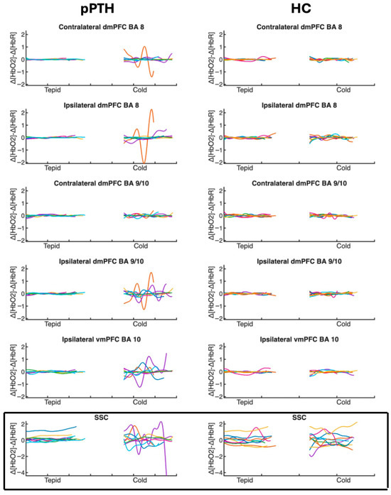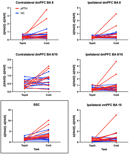 Background/Objectives: Headache after a traumatic brain injury (TBI) is one of the most common post-concussive symptoms and is associated with altered pain processing and elevated disability levels. Understanding physiologic correlates of nociception in individuals with persistent post-traumatic headache (pPTH) may help identify novel treatment targets for pain-related disability. The objective of this case–control study was to compare extra- and intracranial hemodynamic responses to a noxious cold pressor task (CPT) between individuals with pPTH and healthy controls (HC) using functional near-infrared spectroscopy (fNIRS). Methods: Ten individuals with pPTH were compared to ten HC with no history of TBI, persistent headache, or chronic pain. fNIRS optodes over the medial prefrontal cortex (PFC) measured extra- and intracranial peak-to-peak hemodynamic responses during tepid- (control) and cold-water (CPT) hand immersion. Evoked pain responses during the CPT were assessed with numeric pain ratings. Linear mixed effects modeling assessed the role of group and evoked pain on hemodynamic responses. Results: pPTH group membership (p = 0.031) predicted greater extracranial hemodynamic responses to the CPT, whereas intracranial PFC responses did not differ between groups. Regardless of group membership, greater increases in pain intensity during the CPT were associated with increased hemodynamic responses for the dorsomedial PFC (p = 0.031). Conclusions: Compared to controls, individuals with pPTH responded to a noxious cold stimulus with elevated systemic hemodynamic responses regulated by the autonomic nervous system. Irrespective of group, hemodynamic responses within the dmPFC were associated with evoked pain responses to the CPT and may provide a useful biomarker for individual variations in cortical pain processing for healthy and clinical populations.
