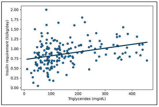 Background: At the onset of Type 1 Diabetes (T1D), international guidelines recommend initiating subcutaneous insulin therapy within a wide dosage range (0.5–1 IU/kg/day), as insulin requirement (IR) varies greatly based on several factors, including age, pubertal status, and the presence of diabetic ketoacidosis (DKA). In clinical practice, some individuals require higher-than-expected IR, leading to prolonged hospitalization. This study aimed to identify predictive factors for elevated IR at T1D onset. Methods: We conducted a retrospective observational study including 218 children and adolescents diagnosed with T1D between January 2010 and September 2020. Clinical and laboratory parameters were collected. IR was defined as the highest daily subcutaneous insulin dose (IU/kg/day) during hospitalization, after resolution of DKA. Results: As expected, DKA severity and HbA1c levels were associated with increased IR. However, the strongest independent predictor in the multivariate model was serum triglyceride level (β = 0.27, p < 0.001), with an adjusted R2 of 0.37. No evidence of multicollinearity was detected, and ROC analysis yielded an AUC of approximately 0.70. Conclusions: Hypertriglyceridemia at T1D onset is independently associated with higher IR, regardless of DKA severity. Early recognition of this marker could help optimize insulin dosing, improve metabolic stabilization, and potentially shorten hospital stays.