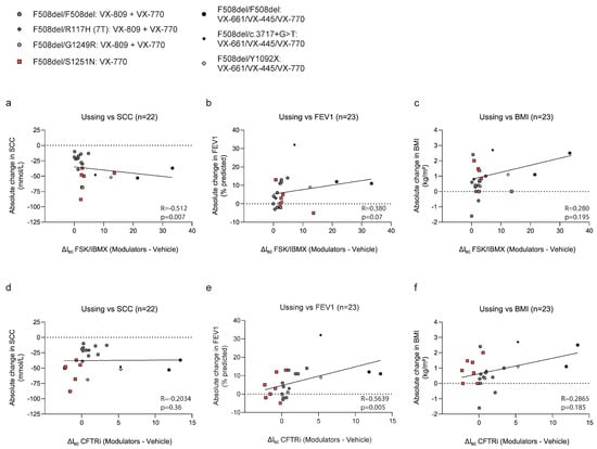 Background/Objectives: Individual responses to CFTR modulators vary widely among people with cystic fibrosis (pwCF), underscoring the need for functional approaches that provide biological context alongside genotype-based therapy selection. Nasal epithelial cultures provide an individual-specific model for theratyping, but most studies rely on freshly isolated cells, restricting repeated testing and long-term sample use. In this study, we tested whether CFTR modulator responses measured in biobanked nasal cells were associated with real-world clinical outcomes. Methods: Cryopreserved nasal epithelial cells from 23 pwCF were differentiated at the air–liquid interface and assessed for CFTR modulator-responsive ion transport using Ussing chambers. In vitro responses were correlated with 6-month changes in sweat chloride concentration (SCC), FEV1, and BMI. Results: Cryopreserved cultures retained donor-specific CFTR modulator responsiveness. Modulator-induced forskolin/IBMX-stimulated currents correlated with changes in SCC (R = −0.512). CFTR inhibitor-sensitive currents correlated with FEV1 (R = 0.564). Associations between forskolin/IBMX-stimulated currents and FEV1 were positive but did not reach statistical significance using two-tailed analysis. BMI changes showed no significant association. Conclusions: Biobanked nasal epithelial cultures preserve clinically relevant CFTR modulator responses at the cohort level, supporting their use as functional assays for population-level assessment in cystic fibrosis. This cryopreservation-based strategy enables repeated testing and may expand access to theratyping beyond freshly obtained samples.