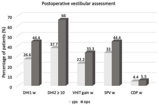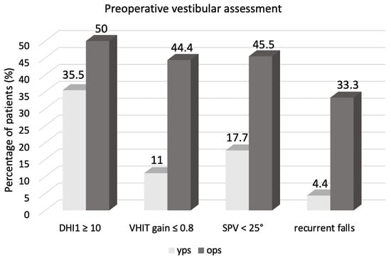 Background: Age-related vestibular decline frequently accompanies presbycusis, and older adults undergoing cochlear implantation (CI) may be particularly vulnerable to postoperative dizziness due to a reduced compensatory capacity and a higher burden of comorbidities. Although CI is an effective treatment for severe-to-profound sensorineural hearing loss in the elderly, its impact on vestibular function remains a critical concern. This study aimed to compare pre and postoperative vestibular performance in older patients (≥65 years) versus younger adults undergoing CI in order to identify the risk factors for postoperative vestibular deterioration and critical issues that characterize this category and carry out personalized preoperative counseling. Methods: In this monocentric observational study, adults undergoing CI were divided into two groups: older patients (OPS, ≥65 years) and younger patients (YPS, <65 years). Vestibular function was assessed preoperatively and one month postoperatively through a Dizziness Handicap Inventory (DHI), history of recurrent falls, clinical examination, video head impulse test (VHIT), bithermal caloric testing, and computerized dynamic posturography (Sensory Organization Test, SOT). Risk factors for postoperative vestibular worsening were analyzed using ANOVA test and chi-square statistics, with significance set at p < 0.05. Results: A total of 63 patients were included, with 18 surgeries involving OPS and 45 involving YPS. Preoperatively, OPS showed significantly higher rates of vestibular abnormalities on caloric testing (55.5% vs. 17.7% bilateral hyporeflexia, p < 0.05) and a higher prevalence of recurrent falls (33.3% vs. 4.4%, p < 0.05). Early postoperative dizziness (DHI1) increased significantly in both groups, but age ≥ 65 was a risk factor for ≥10% worsening (OR 2.2, p < 0.05). At one month, YPS returned to baseline DHI values, whereas OPS showed persistent dizziness with significantly higher DHI2 scores (29.2 vs. 12.9, p < 0.05). Vestibular worsening was identified in 33.3% of VHIT assessments and 44.4% of caloric tests in OPS, with caloric testing proving more sensitive than VHIT. Implantation on the better-functioning vestibular side and the presence of ≥3 comorbidities increased the likelihood of persistent postoperative dizziness. Conclusions: Older age is a significant risk factor for persistent dizziness and vestibular impairment one month after CI. Given the reduced compensatory capacity typical of older adults, vestibular assessment should play a central role in preoperative decision-making, particularly for side selection. Bithermal caloric stimulation is recommended as the most sensitive tool for detecting clinically relevant vestibular changes. Preoperative counseling for older CI candidates should include a detailed discussion of vestibular risks and the possible need for postoperative rehabilitation.
