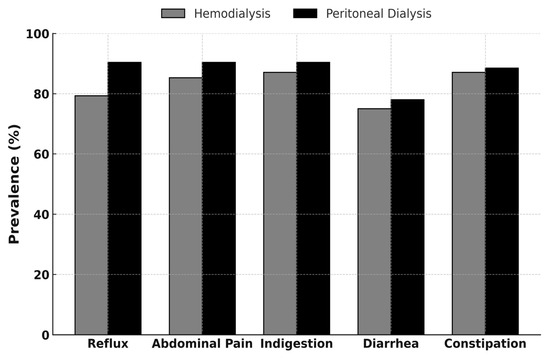 Background: Gastrointestinal (GI) symptoms are highly prevalent in people receiving dialysis and contribute to malnutrition and poor quality of life. We examined the prevalence and severity of GI symptoms in Jordanian adults with end-stage kidney disease (ESKD) treated with hemodialysis (HD) or peritoneal dialysis (PD). Methods: In this cross-sectional study, consecutive adults with ESKD receiving maintenance HD at Al-Karak Teaching Hospital or PD at Al-Basheer Hospital were interviewed using the validated Arabic Gastrointestinal Symptom Rating Scale (GSRS). Domain and total scores (range 1–7) were compared between modalities; a GSRS total score ≥3 defined at least mild overall GI symptom burden. Results: Among 168 ESKD participants (mean age 43.4 ± 15.3 years; 116 HD, 52 PD), 92.2% reported at least one GI symptom. The prevalence of GSRS-defined symptoms was greater in PD (94.2%) than HD (91.4%). PD was associated with significantly higher mean scores in all GSRS domains (reflux, abdominal pain, indigestion, diarrhea, constipation) and a higher total GSRS score (3.33 ± 1.36 vs. 2.36 ± 0.71; p < 0.01 for all comparisons). Upper GI bleeding (UGIB) requiring hospitalization after dialysis initiation occurred more often in HD than PD (15.5% vs. 3.8%; OR 4.59; 95% CI 1.03–20.58). Conclusions: This study demonstrated that dialysis patients had a high prevalence of GI symptoms, with an elevated severity in patients on PD. These findings highlight the need for routine structured assessment of GI symptoms and modality-specific management strategies in dialysis units, particularly for patients on PD.