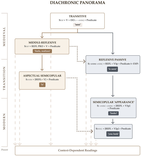 The focus in this corpus-based study is on a set of Spanish constructions formed with the verb of visual perception, ver ‘to See’, and a predicate adjective or participle. In addition to a clearly recognizable transitive schema, the set includes various instances featuring a reflexive clitic pronoun coreferential with the subject, some of which have been argued to evidence the grammaticalization of lexical ver into a univerbated semicopular verb (pronominal verse), meaning little more than ‘be’ in some examples, and proximate to the intransitive sense of English look in other cases. We trace the evolution of these constructions in data spanning the history of the Spanish language, from its recorded beginnings to the present. We establish the need to distinguish two constructional sources of change, namely, an old middle-reflexive and a younger reflexive passive. We draw attention to the “renewal” of the Latin deponent videri ‘appear, look, seem’, which can be said to have taken place in Spanish as a product of the passive-derived process of grammaticalization undergone by ver. And throughout the paper we address problems of analyzability, attributable to the superficially identical strings of words that characterize the constructional patterns with a reflexive morpheme.