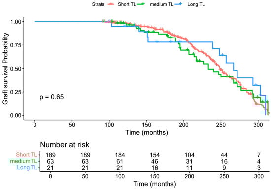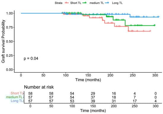 Introduction: Telomeres, which protect chromosome ends, are important in cell replication and are altered by ageing. In the realm of organ transplantation, telomere length has emerged as a potential biomarker for predicting both graft survival and recipient longevity. This study explores the correlation of telomere length with transplant outcomes to assess whether longer telomere length is associated with better long-term graft function and patient survival. Methods: Telomere length (TL) was analysed in 274 European renal transplant pairs (donors/recipients). Recipient DNA was collected before and after kidney transplantation, and donor DNA just prior to transplant surgery. Results: Donor TL was not significantly associated with graft survival. Donor age was a significant predictor of graft failure (1.02, 95% CI: 1.01–1.03, p < 0.01). Post-transplant recipient TL had a significant association with graft survival. Longer TL was associated with an up to 90% reduction in risk of graft failure (HR = 0.10, 95% CI: 0.015–0.71, p = 0.02). Conclusions: In this study, kidney transplant recipients with longer telomere length demonstrated significantly better long-term graft survival. If validated in additional kidney transplant cohorts, recipient telomere length could serve as a valuable biomarker for improving graft failure risk stratification and enhancing the long-term care of transplant recipients.