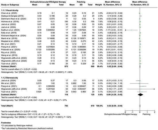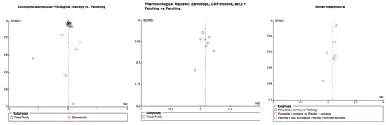 Amblyopia affects 1–4% of the population and remains a leading cause of unilateral visual impairment, with adherence and residual deficits limiting outcomes of standard therapies. This systematic review and meta-analysis compared the effectiveness of conventional and emerging amblyopia treatments in children, adolescents, and adults with anisometropic, strabismic, or mixed amblyopia. Following PRISMA guidelines and PROSPERO registration (CRD420251123552), PubMed, Web of Science, and Scopus were searched up to 5 August 2025 for randomized controlled trials. Sixty-six trials (sample sizes 7–404) were included, with thirty-six contributing to the meta-analysis. Primary outcomes were best-corrected visual acuity (logMAR) and stereopsis. Risk of bias was assessed using the Cochrane tool, and certainty of evidence was assessed using GRADE. Atropine penalization and occlusion demonstrated equivalent effects on visual acuity (mean difference 0.04 logMAR; 95% CI −0.04 to 0.12; moderate-certainty evidence). Digital, dichoptic, binocular, and virtual reality therapies showed a statistically significant but small improvement over patching (mean difference 0.02 logMAR; 95% CI 0.00–0.04; low-certainty evidence). Pharmacological adjuvants combined with patching yielded slightly larger gains (mean difference 0.08 logMAR; 95% CI 0.03–0.13; low-to-moderate certainty). No consistent benefit was observed for stereopsis outcomes. Overall, the certainty of evidence ranged from low to moderate, and most pooled effects were below commonly accepted thresholds for clinically meaningful visual acuity improvement (≈0.1 logMAR, one line). Atropine and occlusion remain equivalent first-line treatments, while adjunctive and multimodal approaches may offer limited additional benefit in selected patients when adherence, tolerability, and engagement are prioritized.