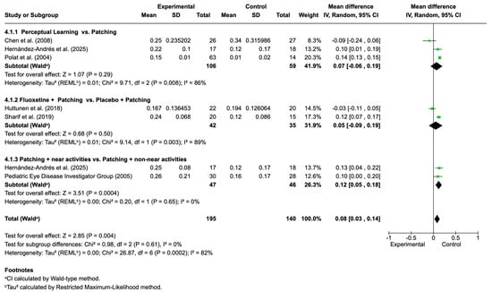Amblyopia affects 1–4% of the population and remains a leading cause of unilateral visual impairment, with adherence and residual deficits limiting outcomes of standard therapies. This systematic review and meta-analysis compared the effectiveness of conventional and emerging amblyopia treatments in children, adolescents, and