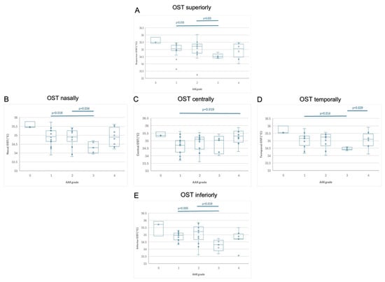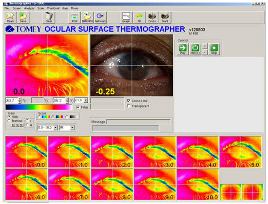 PAX6 haploinsufficiency-related congenital aniridia is frequently associated with ocular surface disease, including meibomian gland dysfunction (MGD), dry eye, limbal stem cell deficiency (LSCD), aniridia-associated keratopathy (AAK), and inflammation. This study measured ocular surface temperature (OST) at the corneal center and four paracentral points