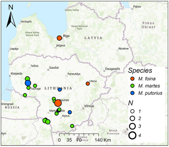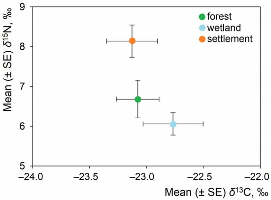 Although sympatric carnivores typically exhibit dietary differentiation to reduce interspecific competition, contemporary isotopic comparisons of European mustelids remain scarce. In this study, we present the first modern stable isotope analysis of hair to evaluate the dietary niches and trophic relationships of pine martens (Martes martes), stone martens (Martes foina), and European polecats (Mustela putorius) in Lithuania and Latvia. The stable carbon and nitrogen isotope values differed among the species. M. martes showed lower δ15N values and more depleted δ13C signatures than the two more synanthropic species. Isotopic niche analyses revealed that M. martes occupied the broadest niche, while M. foina and M. putorius exhibited narrower niches with substantial overlap. Habitat influenced trophic position: individuals from settlements showed higher δ15N values than those from forests or wetlands. In contrast, sex- and age-related differences were weak or absent. These results demonstrate that despite partial spatial coexistence, sympatric mustelids differ primarily in isotopic niche structure rather than mean isotope values and that human-modified environments promote trophic convergence among generalist mesocarnivores. However, the small sample sizes for M. foina and M. putorius mean that estimates of isotopic niche width and overlap should be regarded as preliminary, and observed sex- and age-related patterns likely reflect limited statistical power rather than the absence of intraspecific dietary variation.