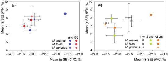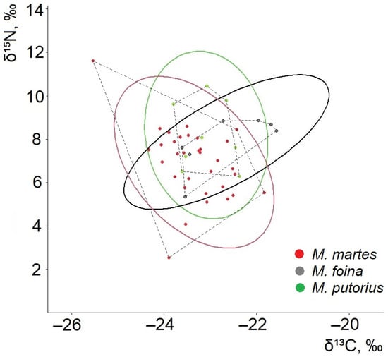 Although sympatric carnivores typically exhibit dietary differentiation to reduce interspecific competition, contemporary isotopic comparisons of European mustelids remain scarce. In this study, we present the first modern stable isotope analysis of hair to evaluate the dietary niches and trophic relationships of pine martens