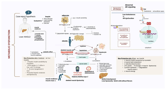 Androgen receptor (AR) signaling has a pivotal role in hepatic lipid homeostasis, as well as in core metabolic functions such as lipogenesis, fatty acid oxidation, and insulin sensitivity. Dysregulation of AR function has been demonstrated in both animal and human studies to disrupt these crucial metabolic pathways, thereby promoting hepatic steatosis. Several causes can lead to AR dysregulation, including genetic mutations or polymorphisms, epigenetic and post-transcriptional modifications, as well as various endocrine disturbances. Prompted by a diagnostically challenging case of a lean 34-year-old male with persistent ALT-predominant transaminasemia, unexplained suboptimal dyslipidemia despite adherence to drug therapy and a healthy lifestyle, and chronically elevated creatine phosphokinase levels irrespective of statin use or exercise intensity, we highlight the overlooked mechanistic link between AR dysfunction and liver–muscle disruption in lean-MASLD patients. Considering the pivotal role of AR in liver–muscle crosstalk, we emphasize the importance of evaluating AR signaling pathways through targeted genetic testing in cases of lean-MASLD among the male population, as well as addressing other extrahepatic manifestations, such as neuromuscular diseases, closely related to AR dysfunction. This clinical strategy may ultimately optimize lean-MASLD management, particularly in view of the emerging utilization of AR-targeted therapeutic modalities, and may also facilitate the management of systemic manifestations associated with altered AR signaling pathways.