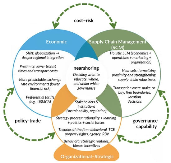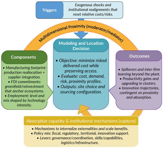 Background: Nearshoring has risen after shocks and policy shifts. We synthesize evidence in a compact loop linking triggers (trade frictions, supply-chain risk, new agreements) to location choices mediated by multidimensional proximity (geographic, institutional, organizational, social, cognitive, functional) to components (manufacturing footprint, Foreign Direct