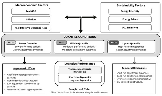 Background: Emerging Asian economies face a critical policy dilemma: macroeconomic and sustainability factors affect high-performing and struggling logistics exporters in fundamentally different ways. Methods: Analysing transportation trade data from China, South Korea, India, Vietnam, Malaysia, and Indonesia (2000–2023) using Panel Quantile Autoregressive Distributed Lag (P-QARDL) methodology, this study investigates asymmetric relationships between macroeconomic indicators (real GDP, inflation, real effective exchange rate), sustainability variables (energy intensity, energy prices, CO2 emissions), and logistics performance measured through transportation trade flows. Results: The results reveal striking performance-dependent heterogeneities that conventional approaches overlook. Economic growth provides 55% larger benefits to high performers (0.345) versus strugglers (0.222), confirming scale advantages. Energy constraints intensify for successful exporters, with energy intensity penalties 12% larger in upper quantiles. CO2 emissions correlate positively with logistics performance, with effects doubling from lower (0.142) to upper quantiles (0.341), highlighting an intensifying sustainability trade-off. Error correction operates 39% faster during high-performance periods. Conclusions: These asymmetric relationships challenge one-size-fits-all policies, necessitating targeted energy efficiency interventions for high performers and growth-enabling support for struggling exporters.