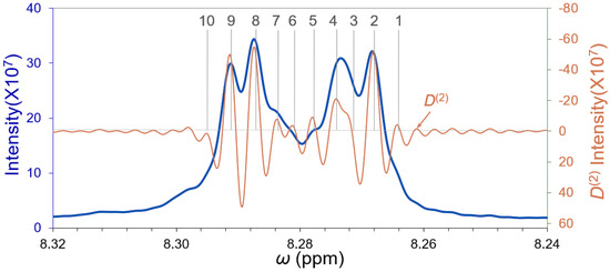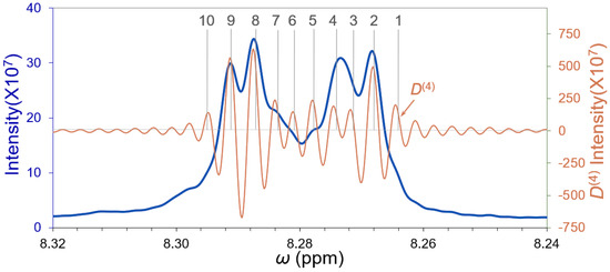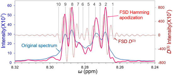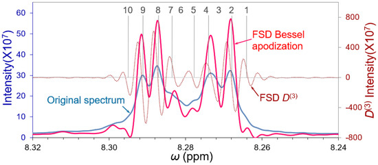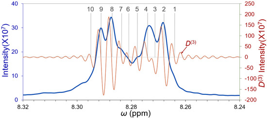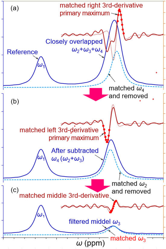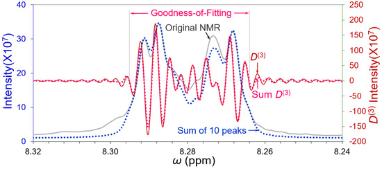 Based on our deconvolution result of the Tetraphenyl porphyrin nuclear magnetic resonance (NMR) spectrum, we initiated a goodness-of-fitting evaluation by overlaying the third-order derivatives of the native NMR spectrum and the entire reconstructed spectrum to appraise the accuracy of the reverse curve fitting