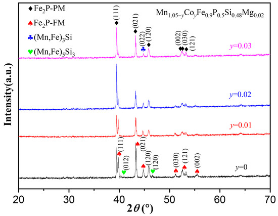 To enhance the wide-temperature-range magnetocaloric performance of (Mn,Fe)2(P,Si) alloys, the effects of Mg-Co co-doping on their structural and magnetocaloric properties were systematically investigated. Mn1.05−yCoyFe0.9P0.5Si0.48Mg0.02 alloys were prepared by the