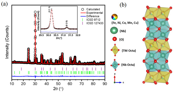 In this work, we present the first report on the synthesis via the sol–gel method of a high-entropy (Fe0.2Co0.2Cu0.2Ni0.2Mn0.2)Nb2O6 with columbite–orthorhombic structure. Polyvinylpyrrolidone (PVP), ammonium niobium oxalate, and equimolar amounts of Fe, Co, Cu, Ni, and Mn ions were used. The refinement of the XRD pattern showed the presence of niobate crystallites with an average size of 48.4 nm and a fraction of 7.6 wt% of a spinel-like phase. At temperatures below 5 K, the DC and AC magnetometry results revealed the presence of a ferromagnetic-like phase due to the niobate phase. The Mössbauer spectrum at 300 K showed a paramagnetic and two magnetically ordered components corresponding to the niobate and the spinel-like phases, respectively. The spectral components were typical of Fe3+, indicating the presence of cation vacancies. The elemental mapping obtained from EDS measurements showed compositional homogeneity. The XRF measurements confirmed a composition consistent with nominal values. These results confirm the feasibility of synthesizing entropy-stabilized columbite oxides via the sol–gel route, opening new opportunities for the design of multifunctional ceramics with tunable structural and magnetic properties for high-performance thermal barrier coatings and energy conversion applications.
