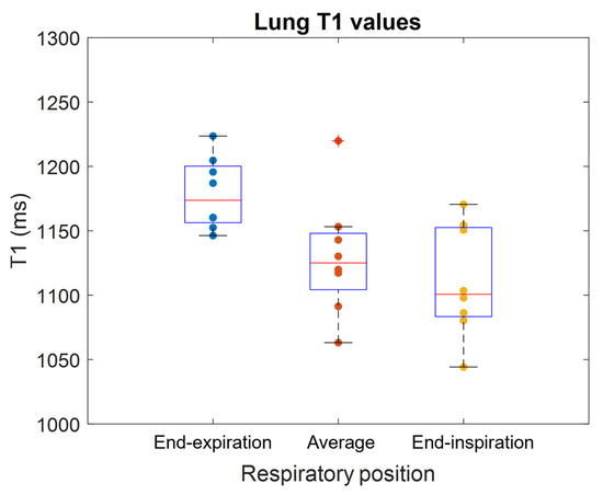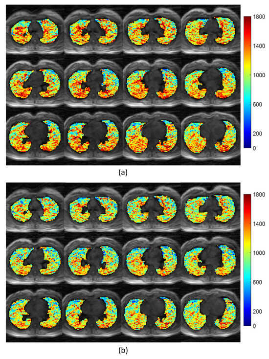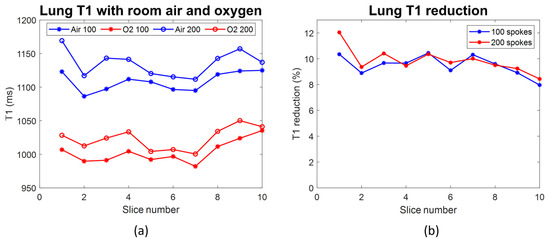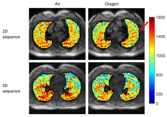 Oxygen-enhanced magnetic resonance imaging (OE-MRI) enables non-invasive assessment of lung function by measuring longitudinal relaxation time ( ) changes induced by alternating inhalation of room air and pure oxygen. In this study, the pulmonary and its reduction after breathing