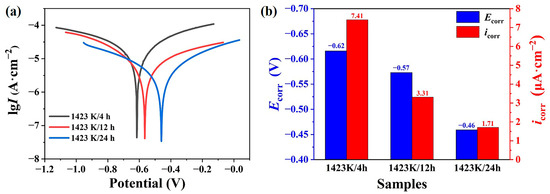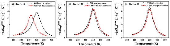 Rare earth-rich NaZn13-type La-Fe-Si-based alloys are promising candidates for near-room-temperature magnetocaloric applications. However, their poor corrosion resistance limits practical applications. The microstructure, corrosion behavior and magnetic entropy change of La0.8Ce0.2Fe9.2Co0.6Si1.2 alloys after annealing were systematically investigated. Annealing treatments were conducted at 1423 K for durations of 4–24 h. As annealing time increased, the α-Fe phase content decreased monotonically from ~7.81wt% to ~2.92wt%, accompanied by significant microstructural evolution. For the 4 h-annealed sample, extensive and large corroded spots were observed, attributed to micro-galvanic corrosion where the α-Fe phase (cathode) and 1:13 matrix phase (anode) formed active electrochemical pairs. Prolonged annealing reduced the corrosion current density by ~50%, directly correlating with the α-Fe phase reduction and improved microstructural homogeneity. Notably, corrosion exhibited a negligible effect on the magnetic entropy change of the alloys. This study confirms that optimizing annealing time to decrease α-Fe content and enhance microstructural uniformity represents an effective strategy to improve corrosion resistance without compromising magnetocaloric performance.
