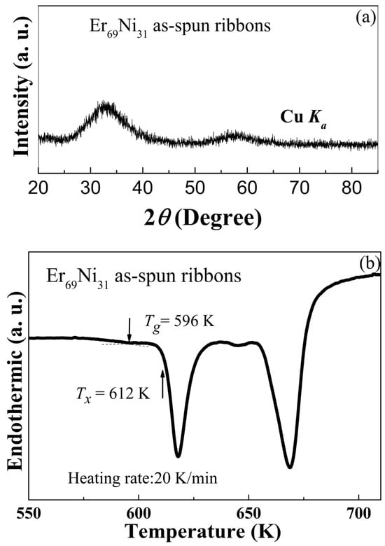 The magnetocaloric response of an amorphous Er69Ni31 alloy was studied in the present work. The eutectic Er69Ni31 alloy was successfully melt-spun into an amorphous ribbon. The formability and magnetocaloric performance of the Er69Ni31 amorphous
