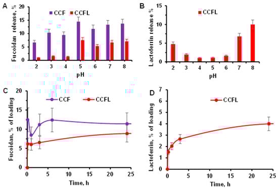 Fucoidan is of considerable interest for the development of drug carriers. The inclusion of fucoidan allows calcium carbonate microparticles in the form of vaterite to acquire new properties, enabling their use in the immobilization of protein preparations. In this work, we investigated the properties of hybrid vaterite microparticles with fucoidan from Fucus vesiculosus obtained by co-precipitation and loaded with recombinant human lactoferrin from goats. The hybrid microparticles had a smaller diameter (3–4 µm), larger surface area (35–36 m2g−1), smaller pore size (5–10 nm average), and more negative ζ-potential (−(11–13) mV) than the control vaterite microparticles. The incorporation of lactoferrin into the microparticles by co-precipitation in complex with fucoidan was greater than when the protein was adsorbed onto the hybrid microparticles. Microparticles with fucoidan and lactoferrin were stable in acidic environments, released both components over a prolonged period at pH 7.4, and possessed mucoadhesive properties and anticoagulant activity. The antibacterial properties of hybrid microparticles with fucoidan and lactoferrin against Bacillus subtilis were characterized. Microparticles of vaterite with fucoidan can serve as a platform for the microfabrication of effective means of delivering therapeutic proteins.