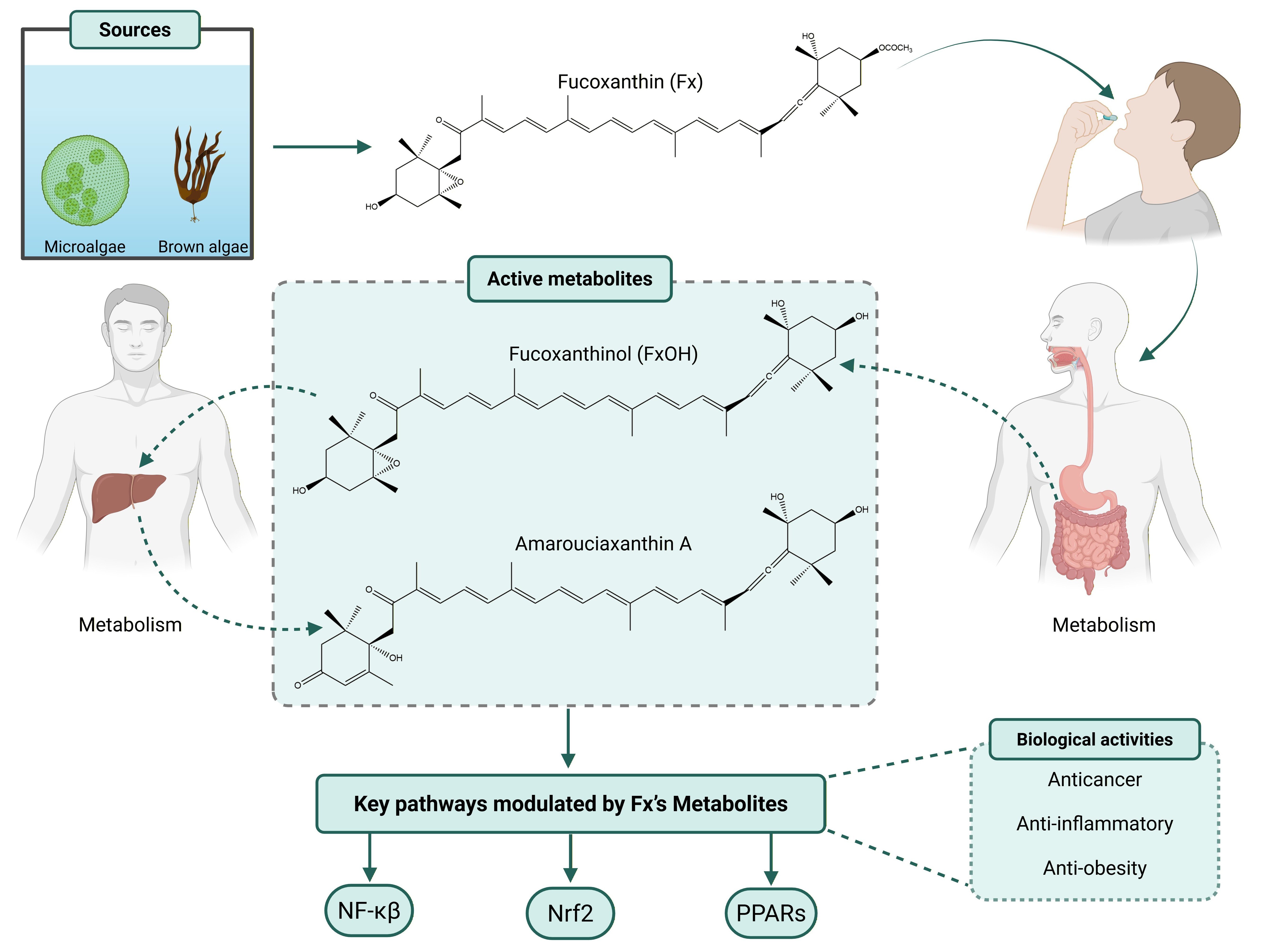 Fucoxanthin (Fx), a marine xanthophyll carotenoid, has attracted considerable scientific attention due to its wide-ranging biological activities, including antioxidant, anti-inflammatory, anti-obesity, and anticancer effects. Despite its substantial therapeutic potential, the clinical application of Fx and its derivatives remains constrained by their structural complexity,