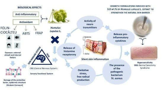 Humulus lupulus L. (hops) is best known for its application in the brewing industry; however, growing scientific interest has revealed its high content of natural antioxidants, including flavonoids and polyphenols. These compounds exhibit pronounced anti-inflammatory activity, positioning hops as a promising plant-derived ingredient for cosmetic use. The present study evaluates the antioxidant properties of Humulus lupulus L. (HL) extract and cosmetic formulations loaded with hop-based active substances. Antioxidant capacity was determined using ABTS, Folin–Ciocâlteu, and FRAP methods. The hop extract showed limited free radical scavenging activity and reducing power; however, these results still confirm its antioxidant potential. Importantly, cosmetic emulsions enriched with the HL extract maintained substantial antioxidant activity, demonstrating successful incorporation and stability of the bioactive compounds within the formulations. Physicochemical stability tests, including pH monitoring and visual evaluation during storage, indicated good stability under different conditions. In vivo studies confirmed the effectiveness of cosmetics containing HL extracts as natural anti-irritant agents, demonstrated by a 10% reduction in erythema after a three-week application period. These findings provide evidence supporting the use of Humulus lupulus L. in the development of plant-based cosmetic products designed to improve the health of skin prone to irritation.