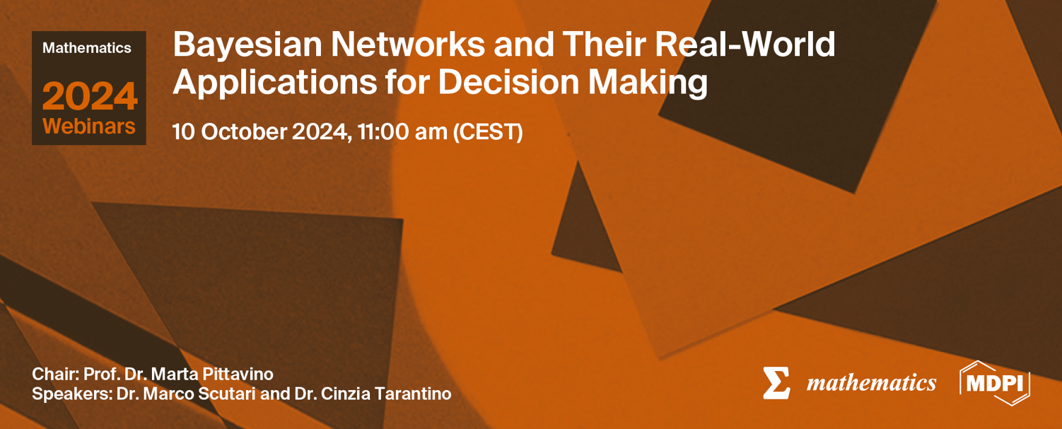 MDPI would like to invite all experts recognized in their fields to attend the webinar organized by Mathematics (ISSN: 2227-7390), entitled Bayesian Networks and Their Real-World Applications for Decision Making. The aim of the webinar is to introduce Bayesian networks, a versatile probabilistic model that integrates statistical methods, data mining, and machine learning for complex data analysis. The session will highlight their ability to simplify complex relationships and address uncertainty, showcasing various real-world applications across different fields.