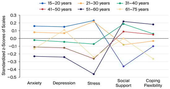 Background and Objectives: The COVID-19 pandemic has caused profound disruptions in socioeconomic, and health domains, with significant implications for mental well-being. The aim of this study was to evaluate the impact of the pandemic on stress, anxiety, and depression, alongside perceived social support, coping flexibility and related factors, and to examine how these issues vary across different age groups. Materials and Methods: A cross-sectional analytical study was conducted in Türkiye between August and December 2020. Data were collected through an online questionnaire including sociodemographic characteristics, pandemic-related concerns, and validated scales: Hospital Anxiety and Depression Scale (HADS), Perceived Stress Scale (PSS), Coping Flexibility Scale (CFS), and Multidimensional Scale of Perceived Social Support (MSPSS). Statistical analyses included descriptive and comparative tests, correlation analysis, multiple linear regression models, and correspondence analysis. Results: Among 1699 participants, 58.0% were female; 24.5% and 42.1% reported anxiety and depressive symptoms above thresholds, respectively. Younger age correlated negatively with stress, anxiety, and depression scores (p < 0.001). Feelings of loneliness, loss of control, ostracism, and sleep or concentration problems were positively associated with anxiety, depression, and stress, but negatively associated with coping flexibility and social support (p < 0.001). The 15–20 age group had the highest anxiety and depression levels and the lowest social support; the 15–30 group showed the highest stress, while the 61–75 group exhibited the lowest coping flexibility. Regression models explained 62.7% of anxiety and 56.6% of depressive symptom variances. Major predictors of anxiety included depressive symptoms, stress, and fear of dying from COVID-19, while depressive symptoms were predicted by age, stress, coping flexibility, social support, and anxiety. Conclusions: The findings highlight the considerable psychological burden and distinct vulnerabilities among age groups. Mental health interventions should be tailored according to age, emphasising the enhancement of social support and coping flexibility to strengthen resilience in future pandemics.