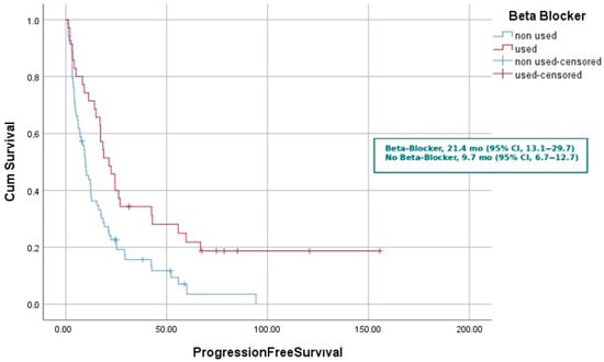Background and Objectives: Erlotinib, a tyrosine kinase inhibitor (TKI), is an established therapy for patients with metastatic non-small cell lung cancer (NSCLC) harboring epidermal growth factor receptor (EGFR) mutations. Preclinical and clinical evidence suggests that chronic stress, mediated through β-adrenergic signaling, promotes tumor progression, angiogenesis, and therapy resistance. Furthermore, interactions between β-adrenergic signaling and EGFR pathways have been hypothesized to negatively influence treatment responses. Based on this rationale, we investigated whether concomitant beta-blocker use may improve survival outcomes in EGFR-mutant NSCLC patients treated with erlotinib. Materials and Methods: This retrospective analysis included 103 patients with metastatic EGFR-mutant NSCLC who received erlotinib. Patients were classified according to concurrent beta-blocker use, defined as continuous therapy for at least six months prior to erlotinib initiation, prescribed for cardiovascular indications. Progression-free survival (PFS) and overall survival (OS) were compared between beta-blocker users and non-users. Results: Patients receiving erlotinib with concomitant beta-blocker therapy achieved a median PFS (mPFS) of 21.4 months (95% CI, 13.1–29.7), compared with 9.7 months (95% CI, 6.7–12.7) in non-users (p = 0.003). Median OS (mOS) was 32.4 months (95% CI, 14.8–50.0) in the beta-blocker group versus 19.9 months (95% CI, 14.8–25.0) in the non-beta-blocker group (p = 0.010). Multivariate Cox regression confirmed beta-blocker use as an independent prognostic factor for both PFS (p = 0.004) and OS (p = 0.014). Conclusions: Concomitant beta-blocker use was associated with significantly prolonged survival in patients with EGFR-mutant metastatic NSCLC receiving erlotinib. These findings support the hypothesis that β-adrenergic inhibition enhances the efficacy of EGFR-targeted therapy. Prospective studies are warranted to validate these results and to further elucidate the underlying biological mechanisms.